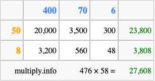 Finally, we add up all the sums we found in step 3 to get our final answer to 476 times 58.
