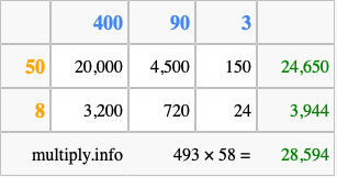 That's all there is to it! As you can see from the box above, the answer to 493 times 58 using the box method is 28,594.