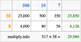 That's all there is to it! As you can see from the box above, the answer to 517 times 58 using the box method is 29,986.