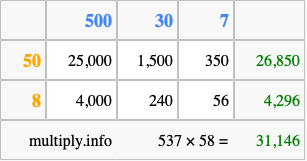 That's all there is to it! As you can see from the box above, the answer to 537 times 58 using the box method is 31,146.