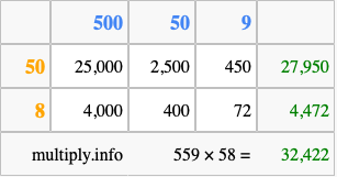 That's all there is to it! As you can see from the box above, the answer to 559 times 58 using the box method is 32,422.