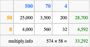 That's all there is to it! As you can see from the box above, the answer to 574 times 58 using the box method is 33,292.