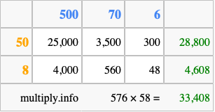 That's all there is to it! As you can see from the box above, the answer to 576 times 58 using the box method is 33,408.
