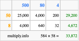 That's all there is to it! As you can see from the box above, the answer to 584 times 58 using the box method is 33,872.