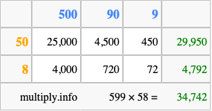 That's all there is to it! As you can see from the box above, the answer to 599 times 58 using the box method is 34,742.