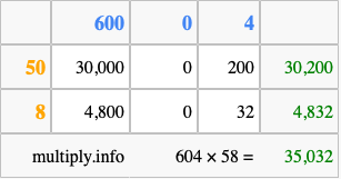 That's all there is to it! As you can see from the box above, the answer to 604 times 58 using the box method is 35,032.