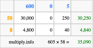 Below is an illustration showing you how to calculate 605 times 58 using the box method, using the instructions above.