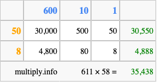 That's all there is to it! As you can see from the box above, the answer to 611 times 58 using the box method is 35,438.