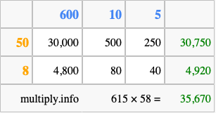 Below is an illustration showing you how to calculate 615 times 58 using the box method, using the instructions above.