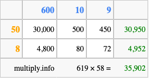 Below is an illustration showing you how to calculate 619 times 58 using the box method, using the instructions above.