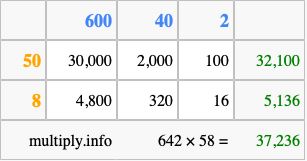That's all there is to it! As you can see from the box above, the answer to 642 times 58 using the box method is 37,236.
