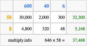 Finally, we add up all the sums we found in step 3 to get our final answer to 646 times 58.