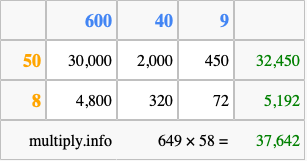 That's all there is to it! As you can see from the box above, the answer to 649 times 58 using the box method is 37,642.