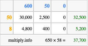 Finally, we add up all the sums we found in step 3 to get our final answer to 650 times 58.