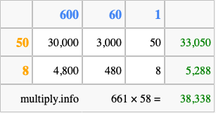 That's all there is to it! As you can see from the box above, the answer to 661 times 58 using the box method is 38,338.