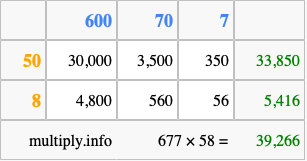 That's all there is to it! As you can see from the box above, the answer to 677 times 58 using the box method is 39,266.