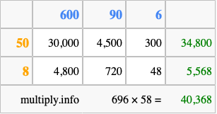Below is an illustration showing you how to calculate 696 times 58 using the box method, using the instructions above.