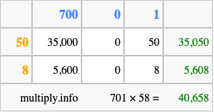That's all there is to it! As you can see from the box above, the answer to 701 times 58 using the box method is 40,658.