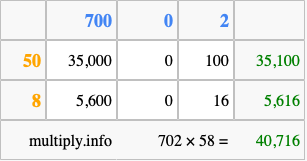 That's all there is to it! As you can see from the box above, the answer to 702 times 58 using the box method is 40,716.