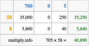 That's all there is to it! As you can see from the box above, the answer to 705 times 58 using the box method is 40,890.