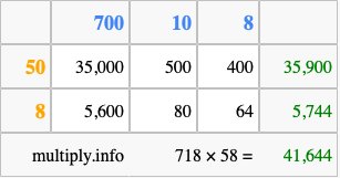 That's all there is to it! As you can see from the box above, the answer to 718 times 58 using the box method is 41,644.