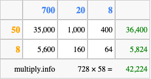 That's all there is to it! As you can see from the box above, the answer to 728 times 58 using the box method is 42,224.