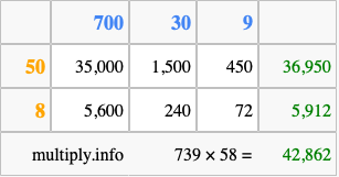 Finally, we add up all the sums we found in step 3 to get our final answer to 739 times 58.