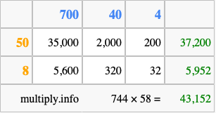 That's all there is to it! As you can see from the box above, the answer to 744 times 58 using the box method is 43,152.