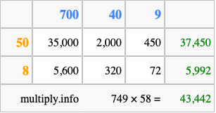 Below is an illustration showing you how to calculate 749 times 58 using the box method, using the instructions above.