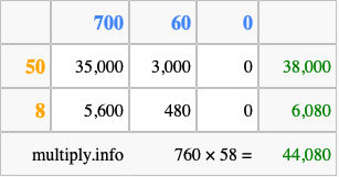 Finally, we add up all the sums we found in step 3 to get our final answer to 760 times 58.