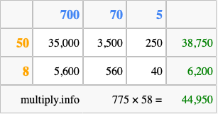 Below is an illustration showing you how to calculate 775 times 58 using the box method, using the instructions above.