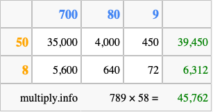 Finally, we add up all the sums we found in step 3 to get our final answer to 789 times 58.