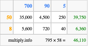 Below is an illustration showing you how to calculate 795 times 58 using the box method, using the instructions above.