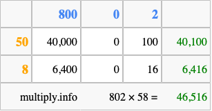 That's all there is to it! As you can see from the box above, the answer to 802 times 58 using the box method is 46,516.