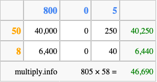 Below is an illustration showing you how to calculate 805 times 58 using the box method, using the instructions above.