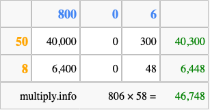 Below is an illustration showing you how to calculate 806 times 58 using the box method, using the instructions above.