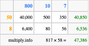 Below is an illustration showing you how to calculate 817 times 58 using the box method, using the instructions above.
