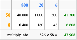 Below is an illustration showing you how to calculate 826 times 58 using the box method, using the instructions above.