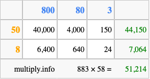 Finally, we add up all the sums we found in step 3 to get our final answer to 883 times 58.