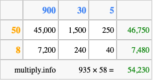 Finally, we add up all the sums we found in step 3 to get our final answer to 935 times 58.