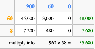 Finally, we add up all the sums we found in step 3 to get our final answer to 960 times 58.