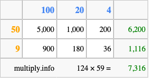 Below is an illustration showing you how to calculate 124 times 59 using the box method, using the instructions above.