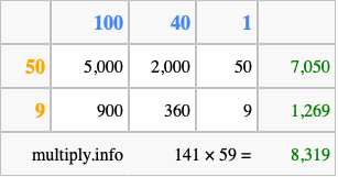 Below is an illustration showing you how to calculate 141 times 59 using the box method, using the instructions above.
