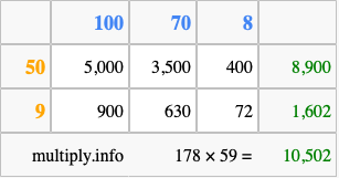 Below is an illustration showing you how to calculate 178 times 59 using the box method, using the instructions above.