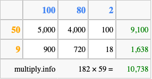 That's all there is to it! As you can see from the box above, the answer to 182 times 59 using the box method is 10,738.