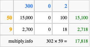 That's all there is to it! As you can see from the box above, the answer to 302 times 59 using the box method is 17,818.