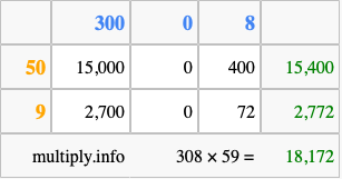 Below is an illustration showing you how to calculate 308 times 59 using the box method, using the instructions above.
