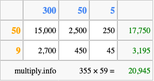 Finally, we add up all the sums we found in step 3 to get our final answer to 355 times 59.