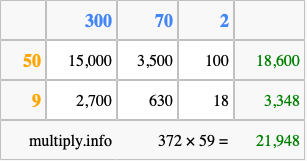 That's all there is to it! As you can see from the box above, the answer to 372 times 59 using the box method is 21,948.