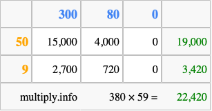 That's all there is to it! As you can see from the box above, the answer to 380 times 59 using the box method is 22,420.